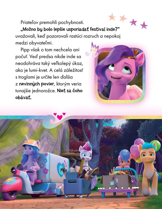 Sedem nových, doteraz knižne nepublikovaných príbehov o čarovných poníkoch, je skvelý spôsob, ako podporiť malých čitateľov ku každodennému čítaniu, a to nielen pred spaním! Príbehy obsahujú všetko, prečo veľkí aj malí milujú poníky: priateľstvo, mágiu, dobrý humor a pútavé príbehy. Je načase vydať sa do Equestrie a sprevádzať Sunny Starscoutovú a jej priateľov na ich dobrodružných cestách!