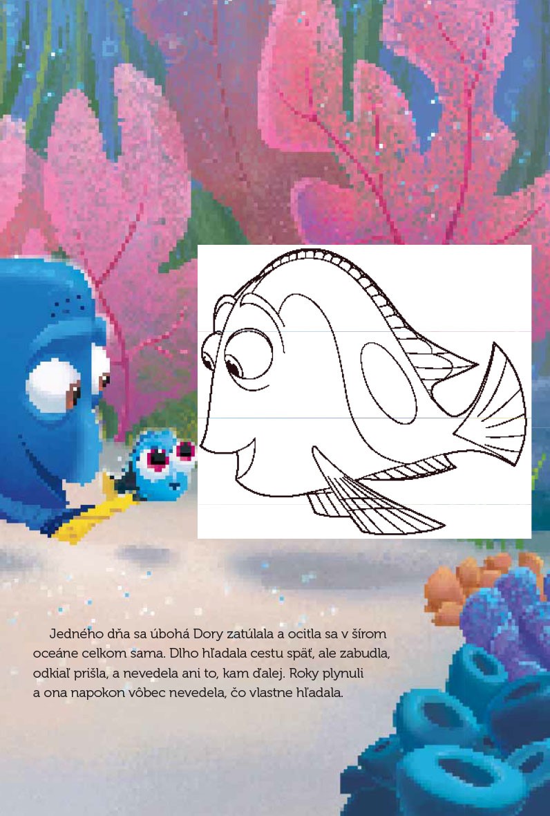 Prečítaj si príbeh o zábudlivej rybke Dory a jej kamarátoch z morských hlbín. Potom si svojich obľúbených hrdinov vyfarbi alebo nájdi samolepku a nalep ju na správne miesto.