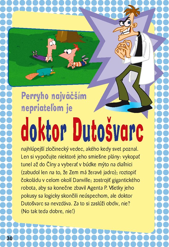 Našli ste niekedy v pivnici schovanú múmiu? Postavili ste najväčšiu horskú dráhu na svete? Pomáhali ste kamarátovi zostrojiť portál na Mars? Asi ťažko! Ale viete, kto to všetko stihol? Phineas a Ferb! Títo dvaja nevlastní bratia sa rozhodne vedia zabávať. (Ich sestru Candy to občas privádza do šialenstva!) A keď práve Phineas s Ferbom neletia do vesmíru alebo nesurfujú v záhrade, radi si rozprávajú vtipy. Na stránkach tejto knihy ich nájdete veľké množstvo, takže sa pohodlne usaďte a bavte sa!
