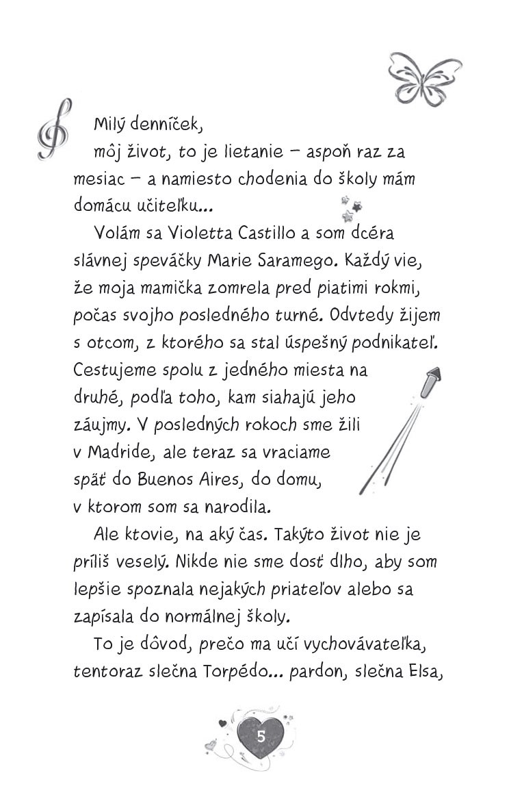 Volám sa Violetta Castillo a budem mať šestnásť rokov. Pre prácu môjho otecka som stále cestovala sem a tam, takže som nikdy nebývala na jednom mieste dosť dlho na to, aby som si tam našla kamarátov alebo začala žiť normálny život. Ale teraz, keď sme sa vrátili do Buenos Aires, sa všetko zmení! Tuším, že ma čaká mnoho dôležitých vecí, a ktovie, možno sa mi jedného dňa splní sen a stanem sa slávnou speváčkou, ako bola moja mamička.