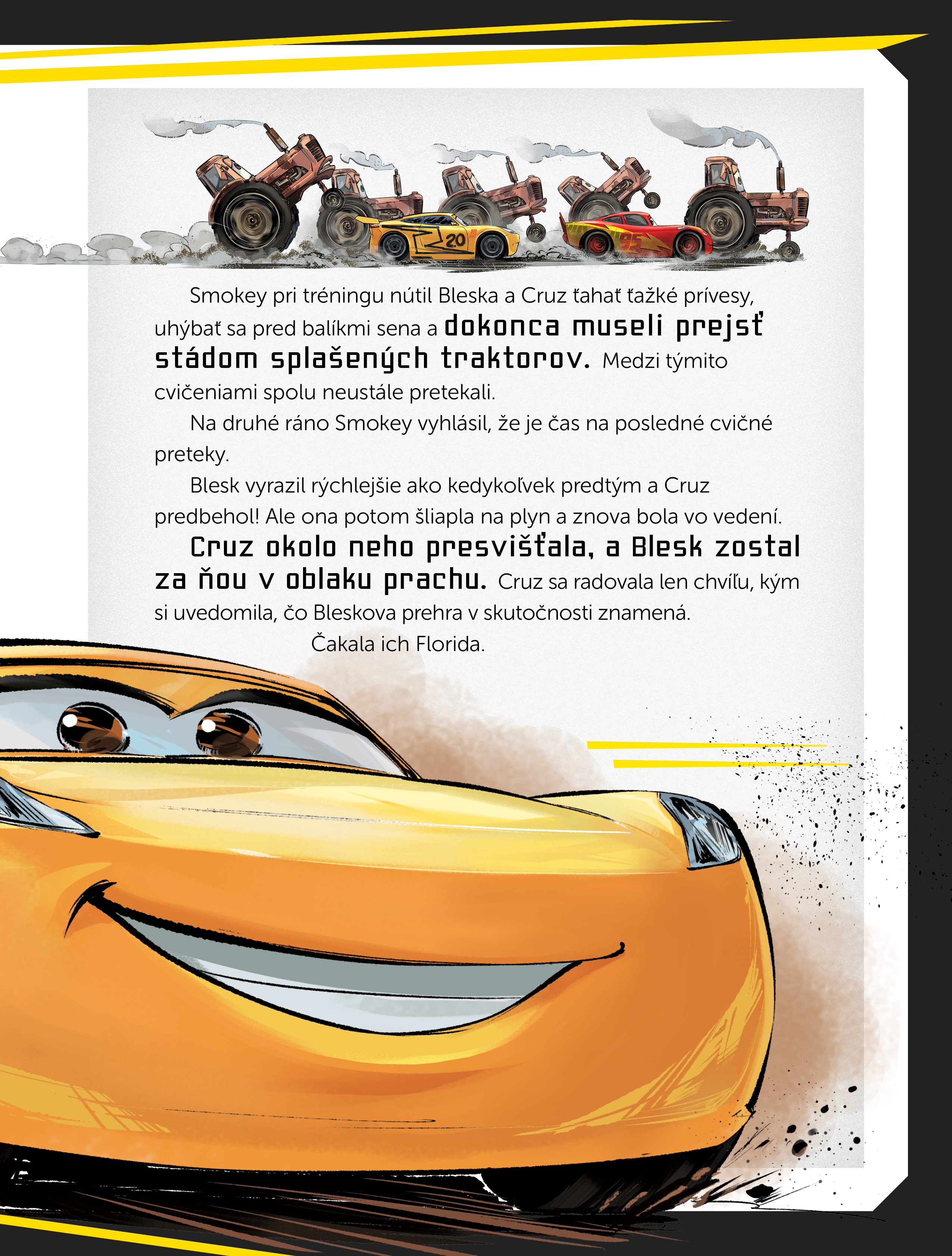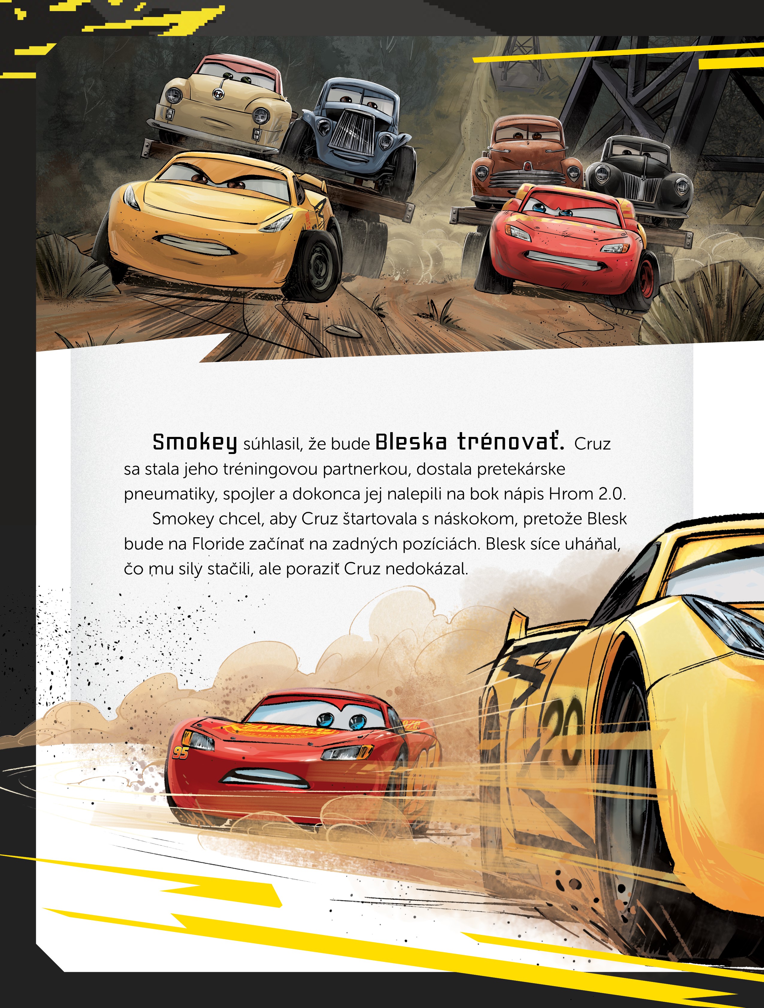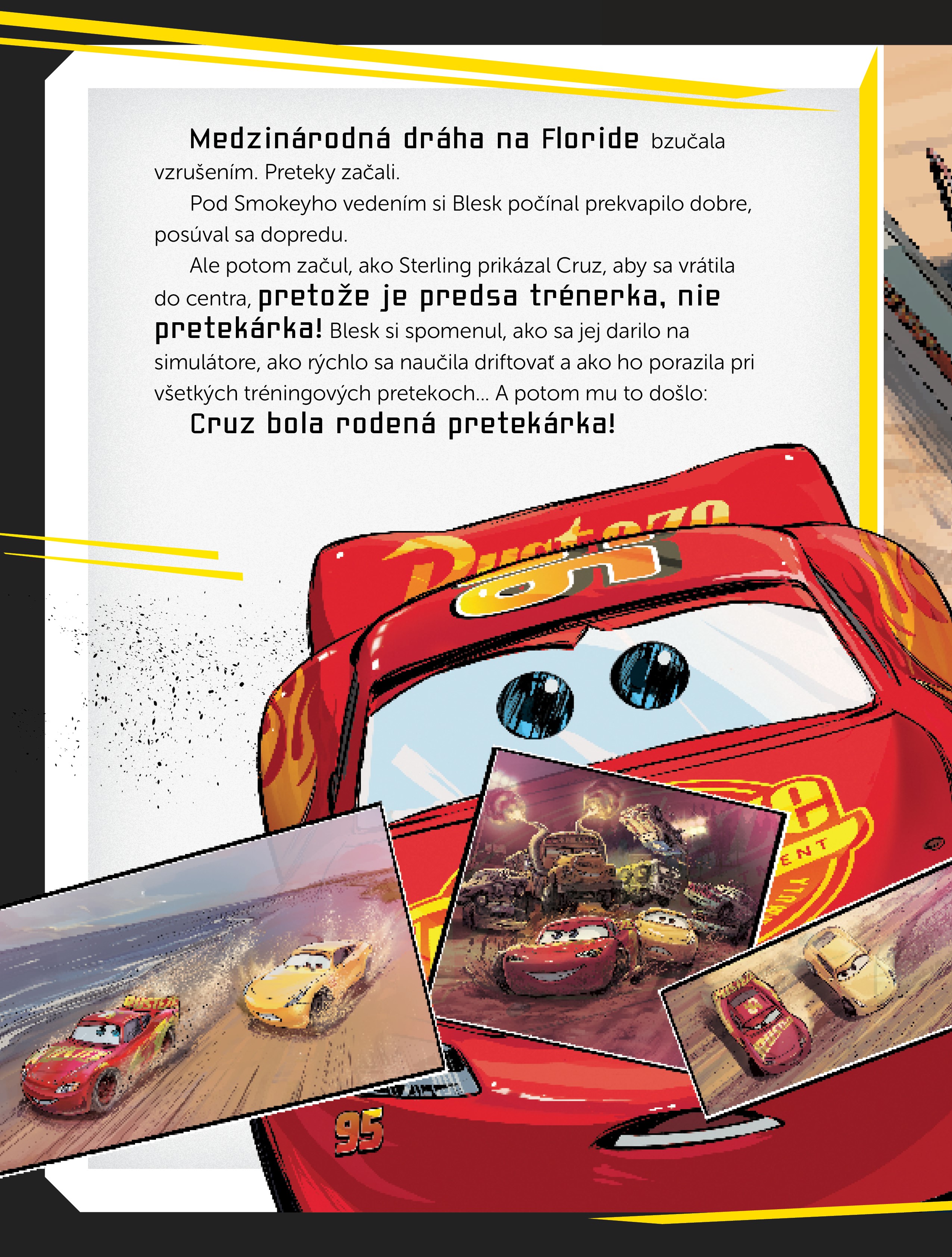 Pretekárske auto Blesk McQueen je miláčikom detí na celom svete. Je ctižiadostivý, ale voči svojim súperom vždy férový. Vo filme Autá 3 od spoločnosti Disney Pixar musí vyriešiť otázku, či sa dokáže vyrovnať autám novej generácie, ktoré sú vybavené tou najmodernejšou technológiou. V týchto pevných doskách nájdu deti knižku s pútavým príbehom na motívy filmu a 3D model z penového kartónu.