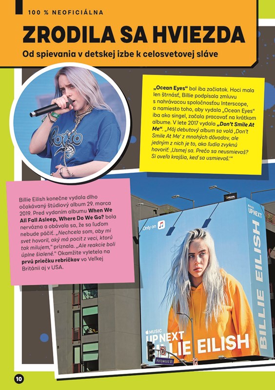 Billie Eilish nie je iba súčasným popovým fenoménom, ale najmä hlasom mladej generácie. Objav všetko, čo musíš vedieť o mladej hudobníčke, ktorá láme svetové rekordy, vybočuje zo zabehnutých koľají a mení všetko od základov. Zisti, ako sa vyvíjal jej štýl, čo si v skutočnosti myslí o sláve, a s ktorými aspektmi svojho života sa musela vyrovnať. Všetko zistíš v úžasnom sprievodcovi najznámejšou tínedžerkou planéty.
