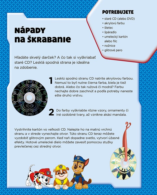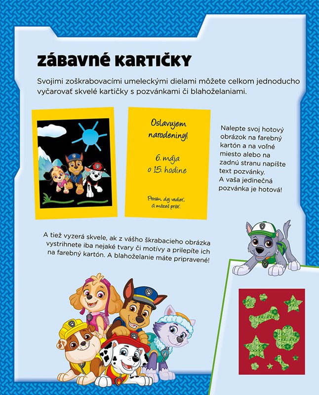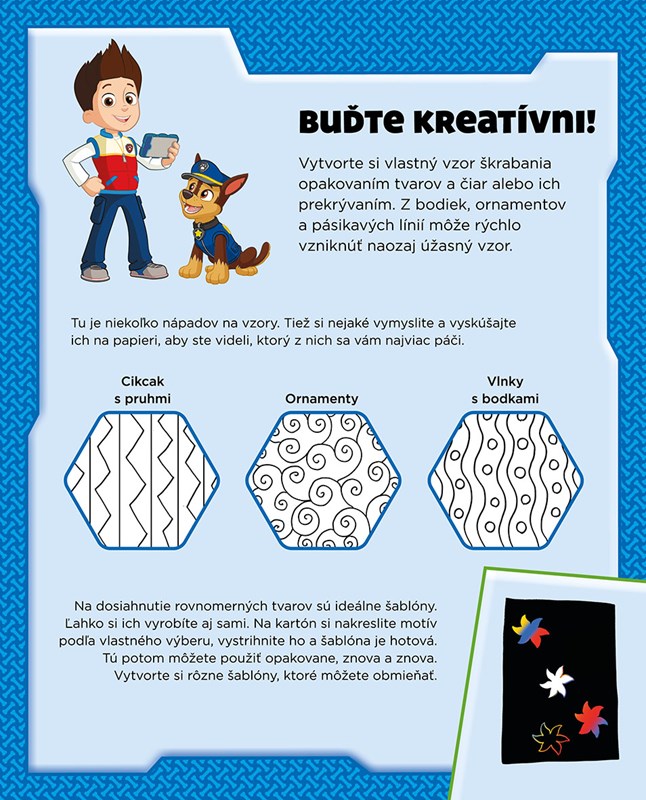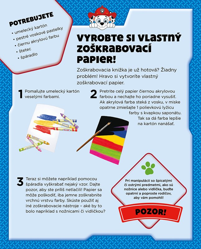 Pomocou priloženej drevenej paličky postupne odhaľujte zaujímavé motívy obľúbených hrdinov z Adventure Bay. Nechajte sa viesť čiastočne odhalenými obrázkami či pestrými obrysovými líniami. Alebo môžete popustiť uzdu svojej fantázii a vytvoriť si vlastné vzory na farebnom pozadí. Na zadnej strane zoškrabovacích obrázkov dokonca nájdete aj skvelé maľovanky kamarátov z Labkovej patroly.