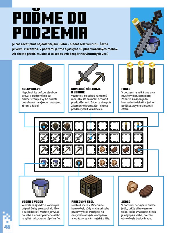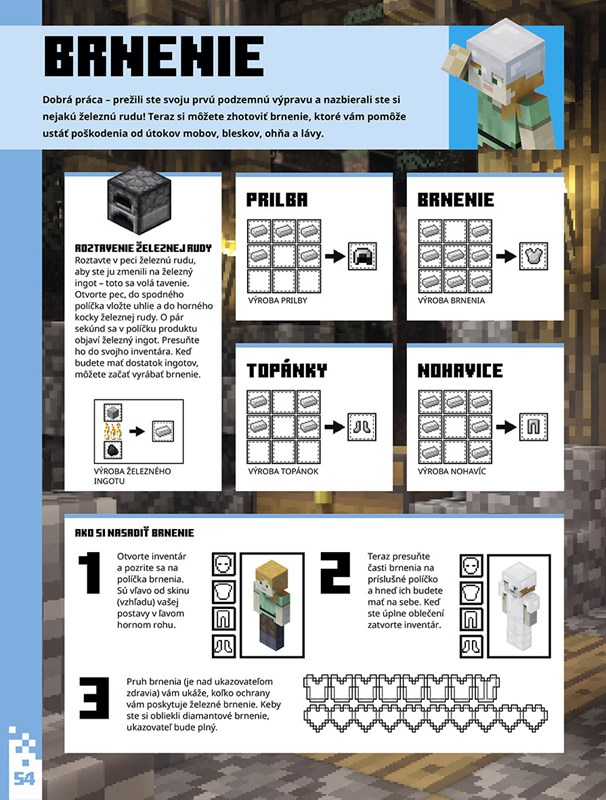 Vydajte sa s touto knihou do nebezpečného sveta Minecraftu. Naučíte sa ťažiť materiály, vyrobiť si náradie a brnenie, nájsť si jedlo a postaviť si úkryt. Dozviete sa dôležité informácie a tipy o zvieratách, moboch a miestach, na ktoré narazíte počas svojej cesty, od kráv a creeperov až po dediny a podzemné banské šachty. Vaše minecraftové dobrodružstvo sa práve začína!