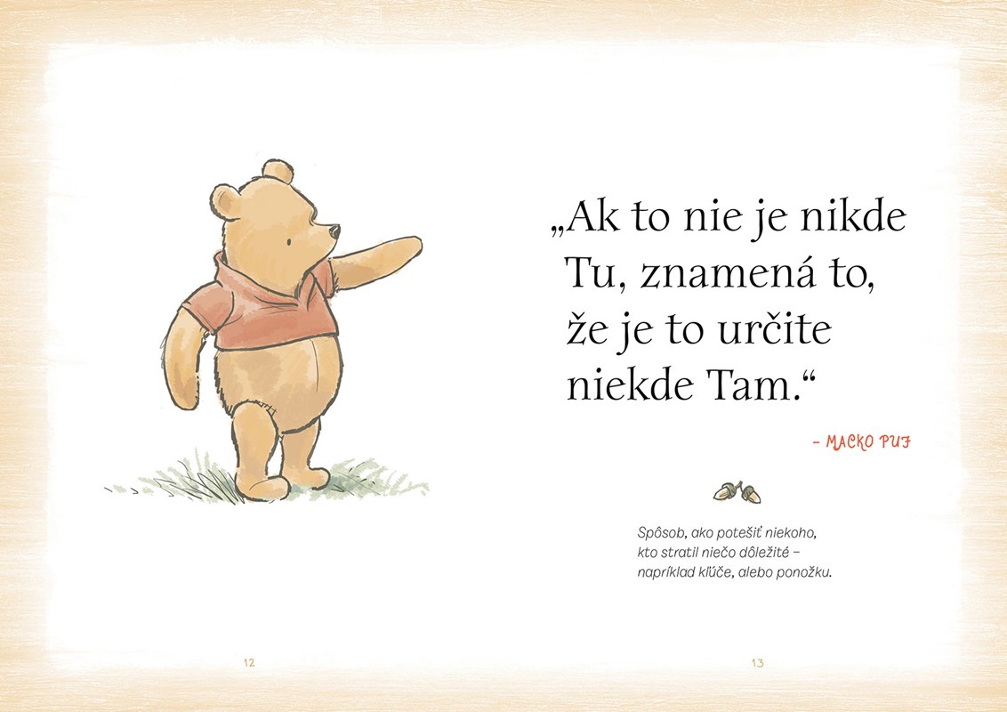 Macko P Puf, ten najmilší medvedík všetkých čias, býva niekedy považovaný za medvedíka s malým rozumčekom – hoci, ako všetci vieme, ukrýva v sebe veľa životných múdrostí. V tejto knižke nájdete inšpirujúce citáty na každú príležitosť, ktorých autormi sú obyvatelia Stoakrového lesa – Puf a jeho kamaráti. Ich bystré a prekvapivé postrehy o tom, ako byť sám sebou, o priateľstve, o umení usporiadania vecí, o Niečom a o Ničom nielen pobavia, ale aj prinútia zamyslieť sa.